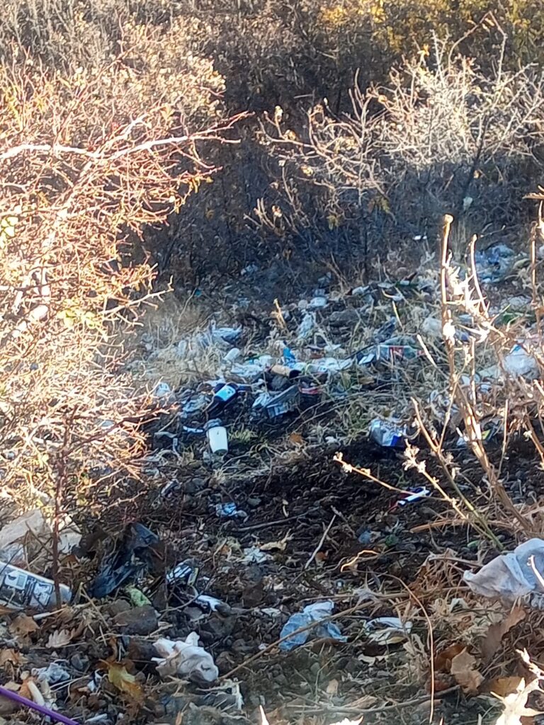 Pet şişeler, plastik poşetler, kırık camlar, yemek artıkları ve yanmış lastik kalıntıları tepenin her köşesini kaplamış durumda.