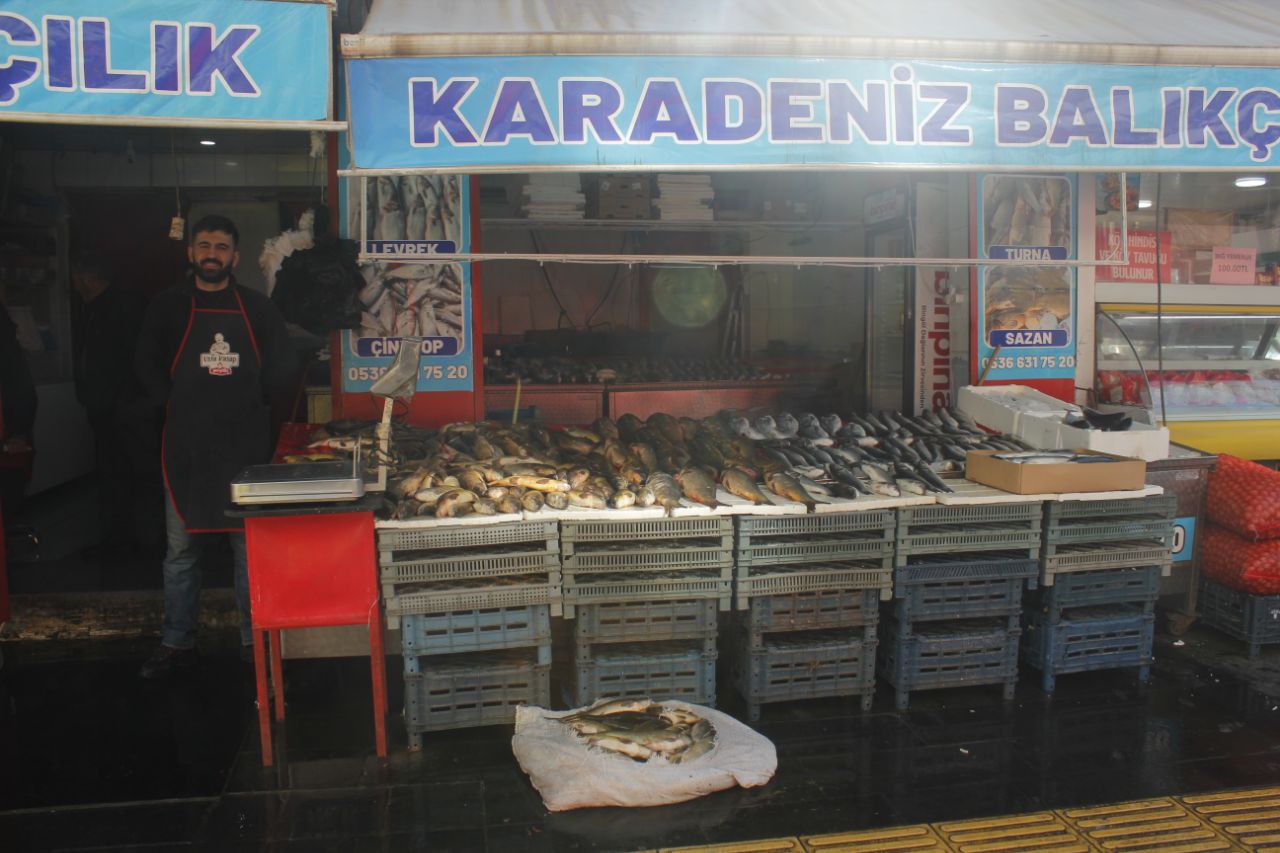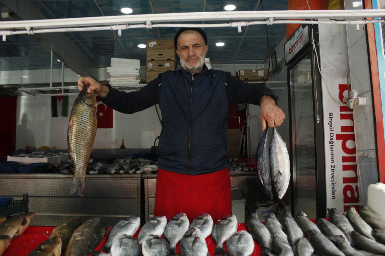 Bingöl’de Balıkçı Nesih olarak olarak bilinen Nesih Demir’in tezgahında birçok balık bulunuyor. Hamsi, istavrit, palamut, çipura, levrek, alabalık, somon ve sazan ilk göze çarpan balıklardan. Mikrofon uzattığımız Balıkçı Nesih, bu dönemde Karadeniz Palamudunun bol çıktığını söyledi.