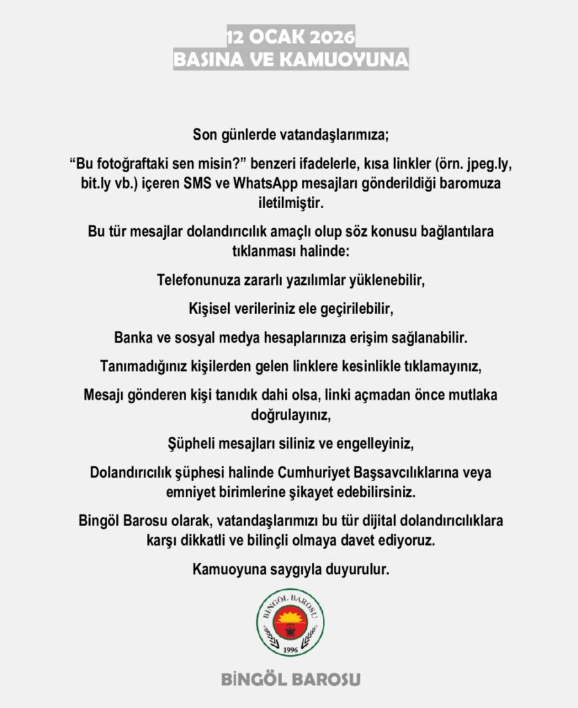 BİNGÖL – Bingöl Barosu, son günlerde artış gösteren ve vatandaşları hedef alan yeni nesil dijital dolandırıcılık yöntemi hakkında acil bir duyuru yayımladı. SMS ve WhatsApp üzerinden gelen şüpheli linklerin büyük bir güvenlik tehdidi oluşturduğu vurgulandı.