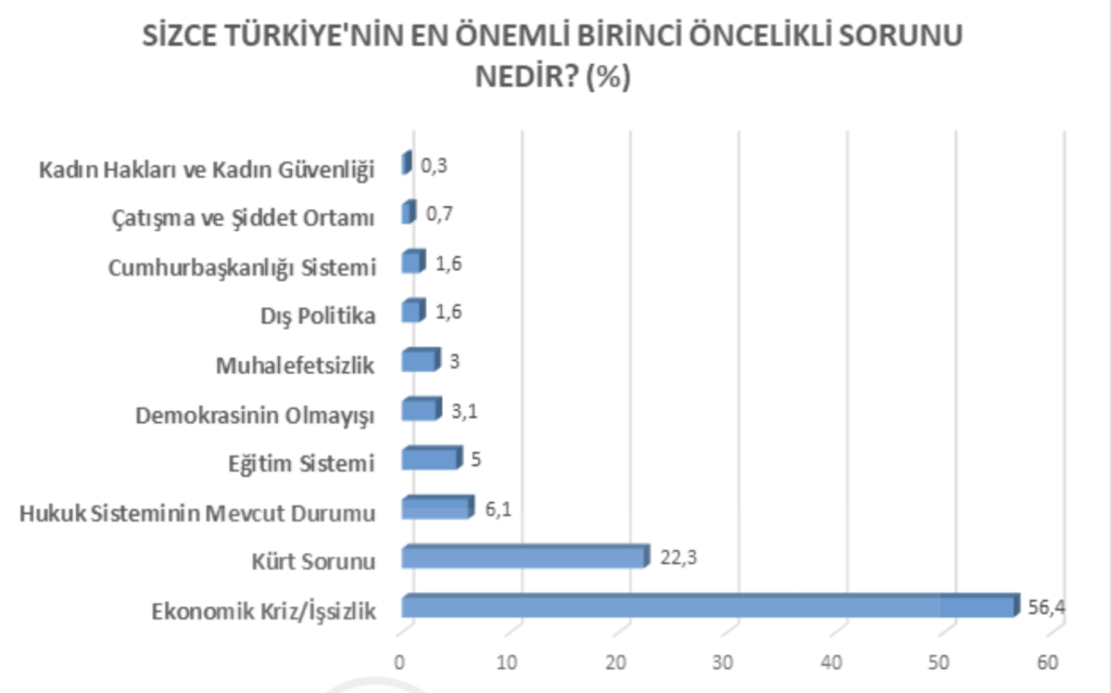 Katılımcılara göre Türkiye’nin öncelikli sorunları listesinde ekonomi, Kürt meselesinin önünde yer alıyor.