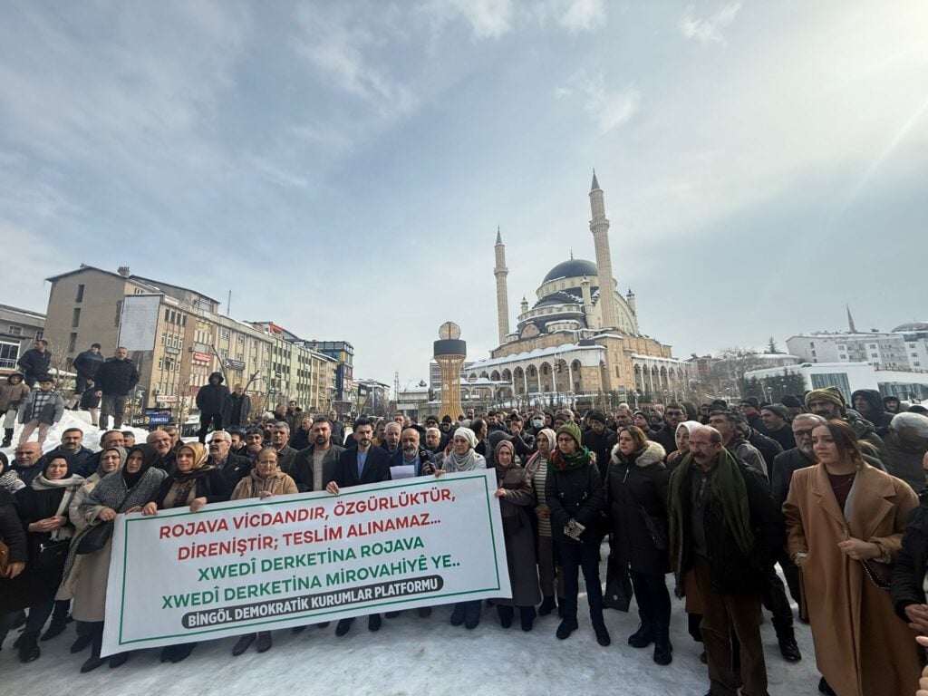 DEM Parti Bingöl il binasından kent merkezine kadar yürüyen kitle, “Biji Berxedana Rojava” ve “Rojava faşizme mezar olacak” sloganları attı.