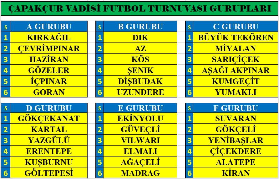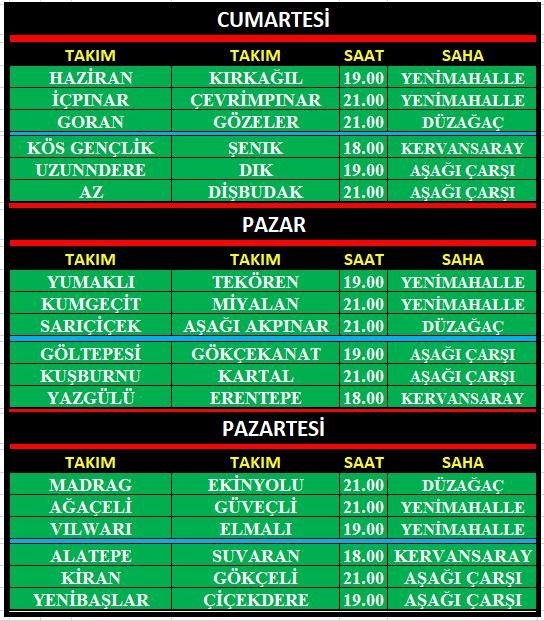 Herkesin ilgiyle beklediği turnuva bugün 18.00’da Kervansaray’da Kös Gençlik ve Şenik arasındaki müsabakayla başlıyor. Her gün 6 maçın oynanacağı turnuvada maçlar Çamlık Arena, Aşağı Çarşı Sentetik, Düzağaç Sentetik ve Kervansaray Sentetik Sahası’nda oynanacak. Haftanın fikstürü şöyle: