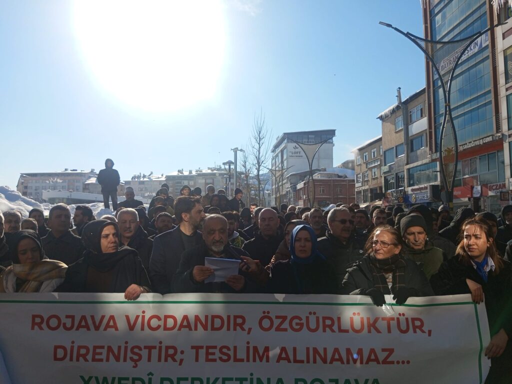 DEM Parti il binası önünde toplanan kitle, sloganlar eşliğinde kent meydanına kadar yürüdü. Yürüyüş boyunca “Yaşasın Rojava direnişi” ve “Rojava kadın devrimi yaşasın” sloganları atan grup, saldırıların bir an önce durdurulmasını talep etti. Yoğun güvenlik önlemleri altında gerçekleşen yürüyüşün ardından meydanda bir basın açıklaması yapıldı.