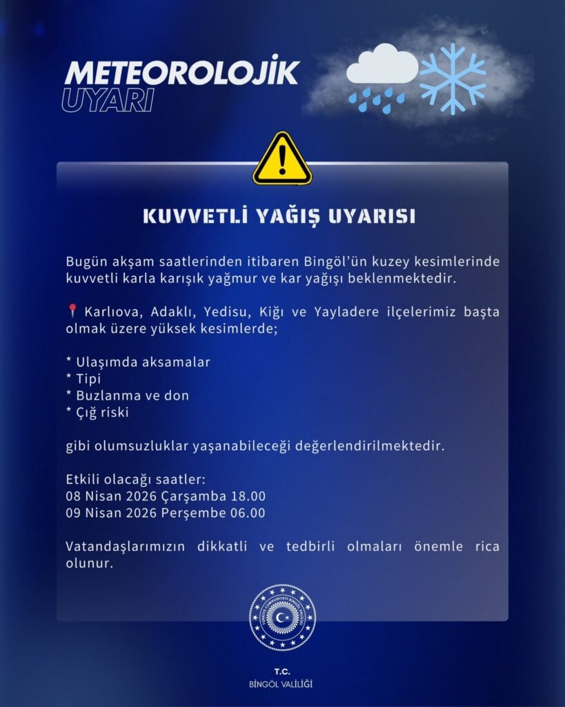 Valilikten yapılan açıklamaya göre, yağışların 8 Nisan Çarşamba saat 18.00 ile 9 Nisan Perşembe saat 06.00 arasında en üst seviyeye çıkması bekleniyor. Başta Karlıova, Adaklı, Yedisu, Kiğı ve Yayladere ilçeleri olmak üzere, yüksek kesimlerde şu olumsuzluklara karşı dikkatli olunması istendi: