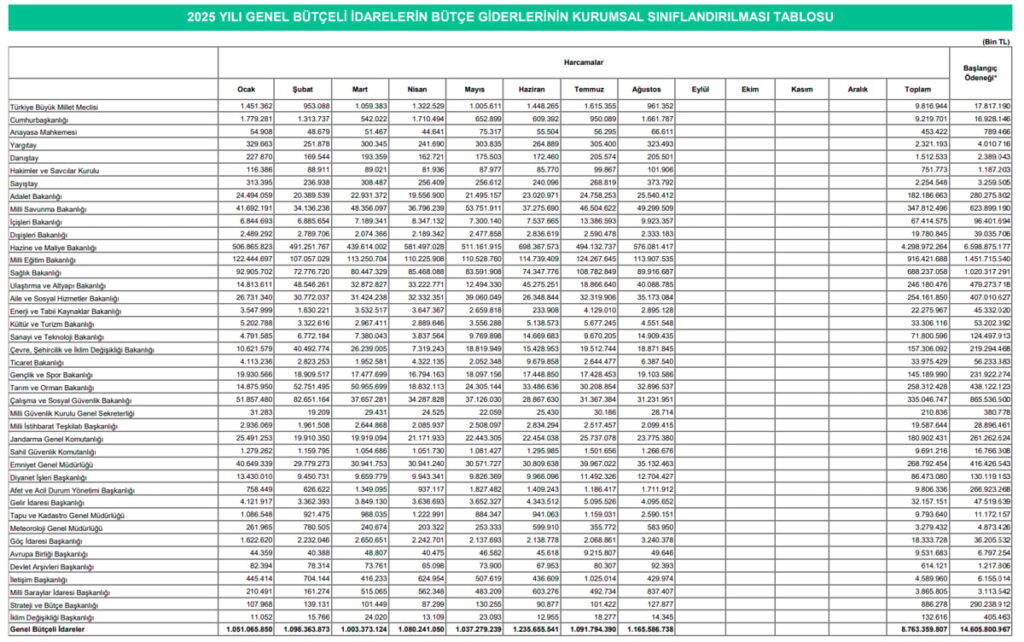 Gülcan Kış, TBMM‘de gazetecilere yaptığı açıklamada, 2025’in Ocak-Ağustos dönemine ilişkin genel bütçeli idarelerin giderlerini detaylı bir tabloyla paylaştı.