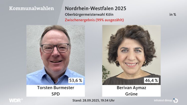Almanya’nın en kalabalık eyaleti Kuzey Ren-Vesfalya’da heyecanla beklenen Köln belediye başkanlığı seçimlerinin ikinci turu tamamlandı. Yeşiller Partisi’nin güçlü adayı Berivan Aymaz, rakibi SPD’li Torsten Burmester karşısında çekişmeli bir mücadele verse de, %53,5 oyla yenilgiye uğradı. Aymaz ise %46,5 oy oranıyla ikincilikle yetinmek zorunda kaldı. Bu sonuçlarla Köln’ün yeni belediye başkanı Torsten Burmester olarak belirlendi.